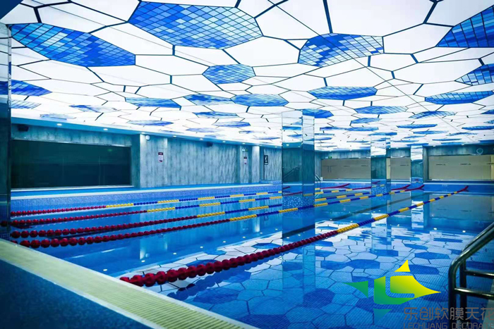 熱烈祝賀我公司徐州游泳館泳池防潮軟膜天花吊頂安裝順利完工并交付客戶使用,此泳池吊頂材料采用我公司高清UV精印防潮天花膜材,內(nèi)藏防水LED光源,透光效果,亮度高無需再做其他照明設(shè)備,整體頂面全部采用我公司專用防潮膜材,安裝效果得到了客戶的滿意,提高了整體裝飾檔次。 實際安裝效果如下圖: